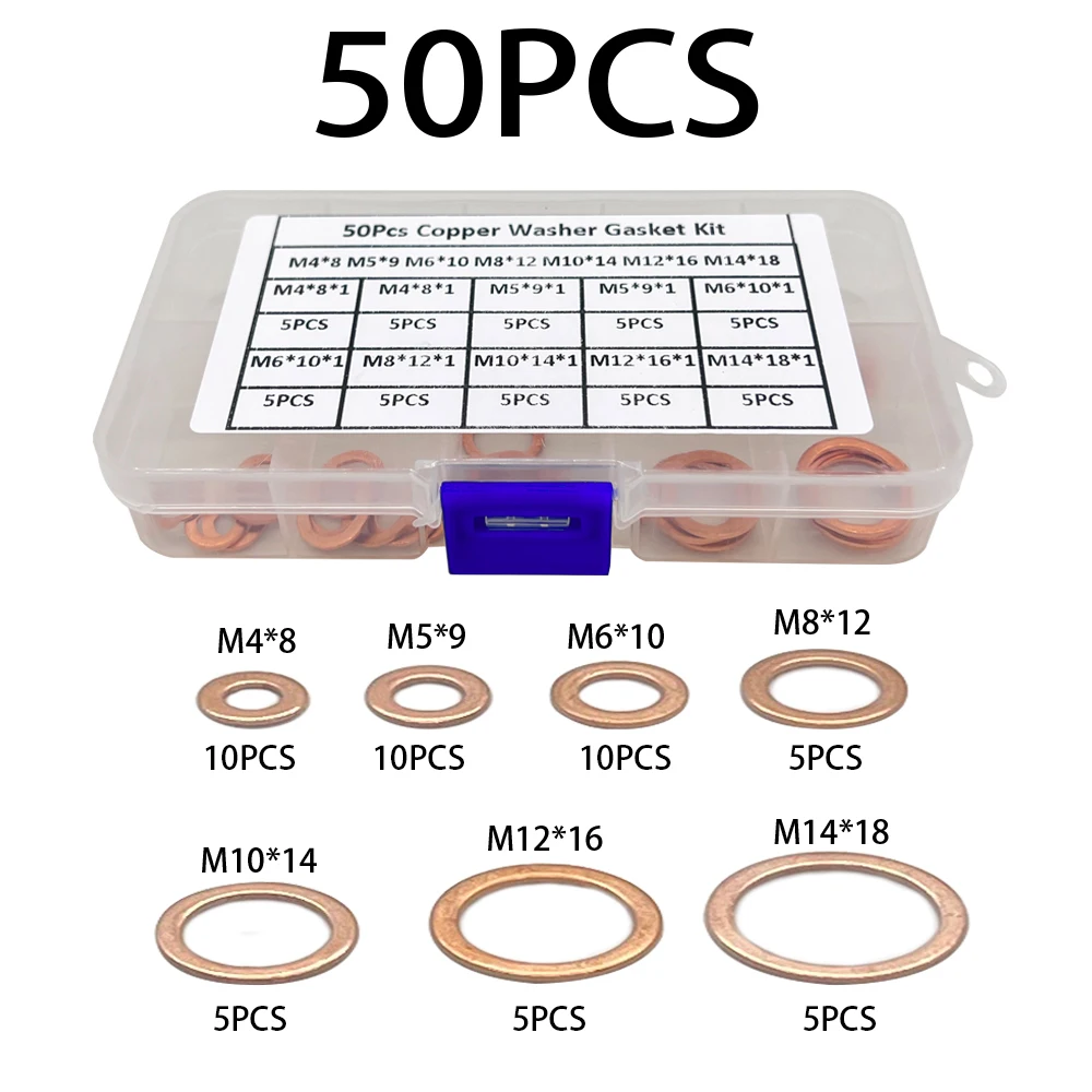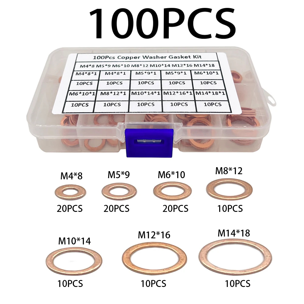100Pcs Copper Washer Gasket Nut And Bolt Set Flat Ring Seal Assortment Kit With Box M4/M5/M6/M8/M10/M12/M14 For Sump Plugs