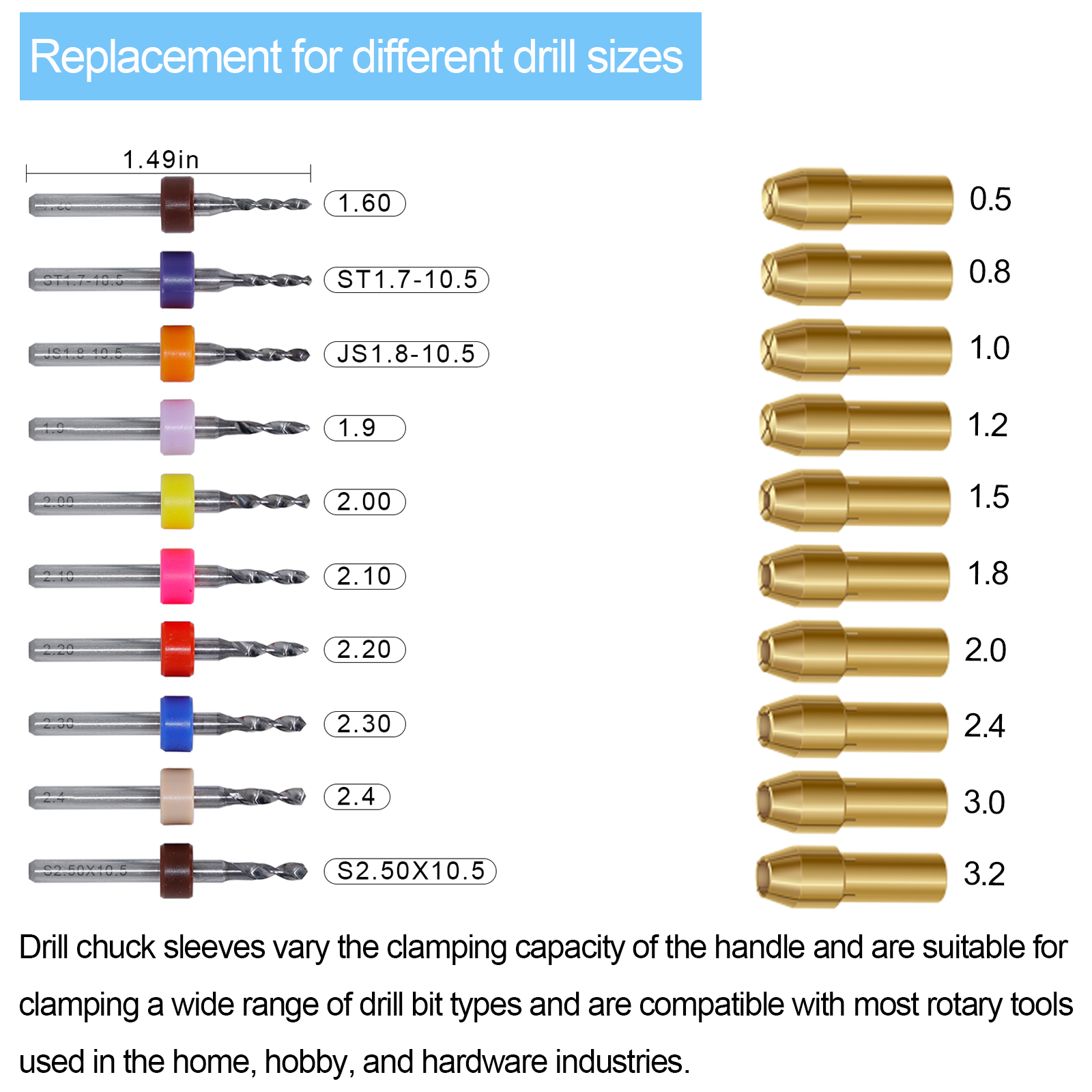 The Drill Holder allows you to change the clamping capacity of the handle and is suitable for clamping all types of drills and is compatible with most rotary tools used in the home, hobby and hardware industries. The drill bit included in this kit is a 3.175 size drill bit, if you want to change to a different size bit or drill just need to match a different size drill chuck, the drill chuck is available in sizes 0.5, 0.8, 1.0, 1.2, 1.5, 1.8, 2.0, 2.4, 3.0, 3.2, and can accurately adapt to most of the accessories on the market!