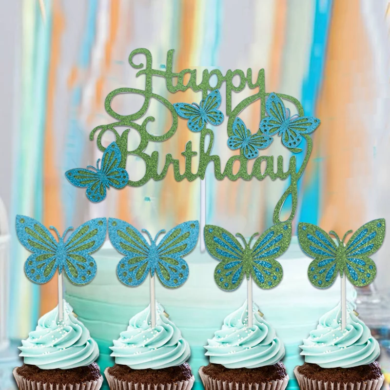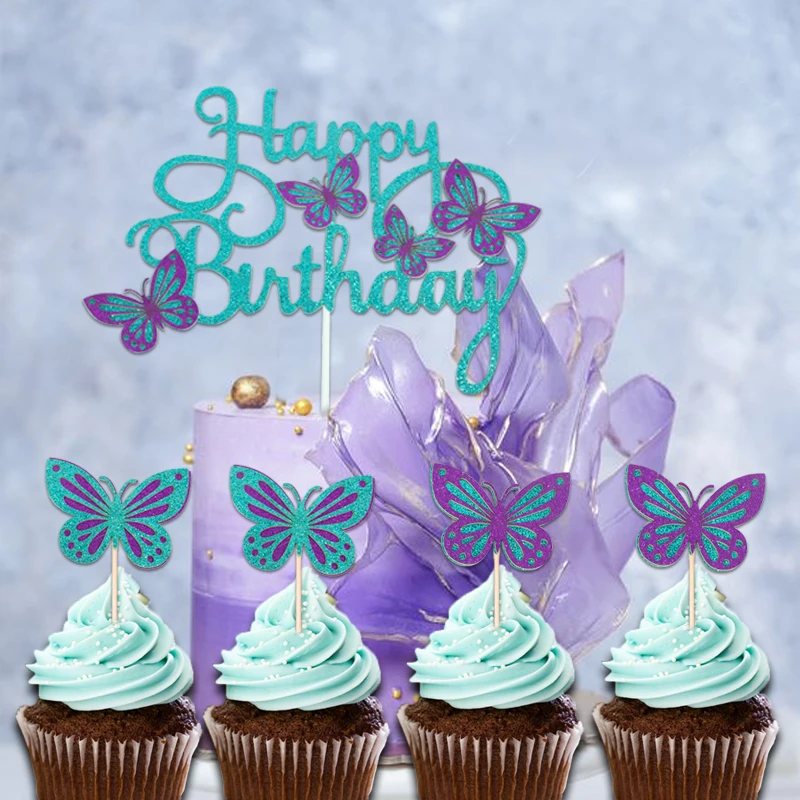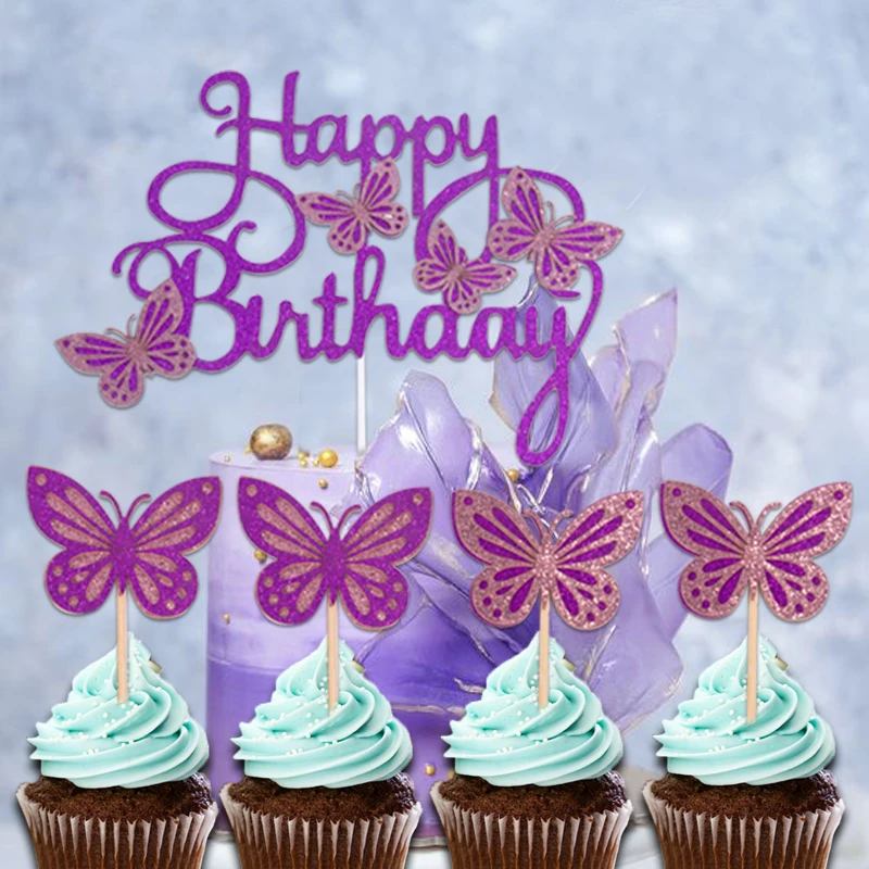 13pcs Pink Butterfly Cupcake Toppers Happy Birthday Cake Decorations Girls Birthday Party Decorations Baby Shower Supplies