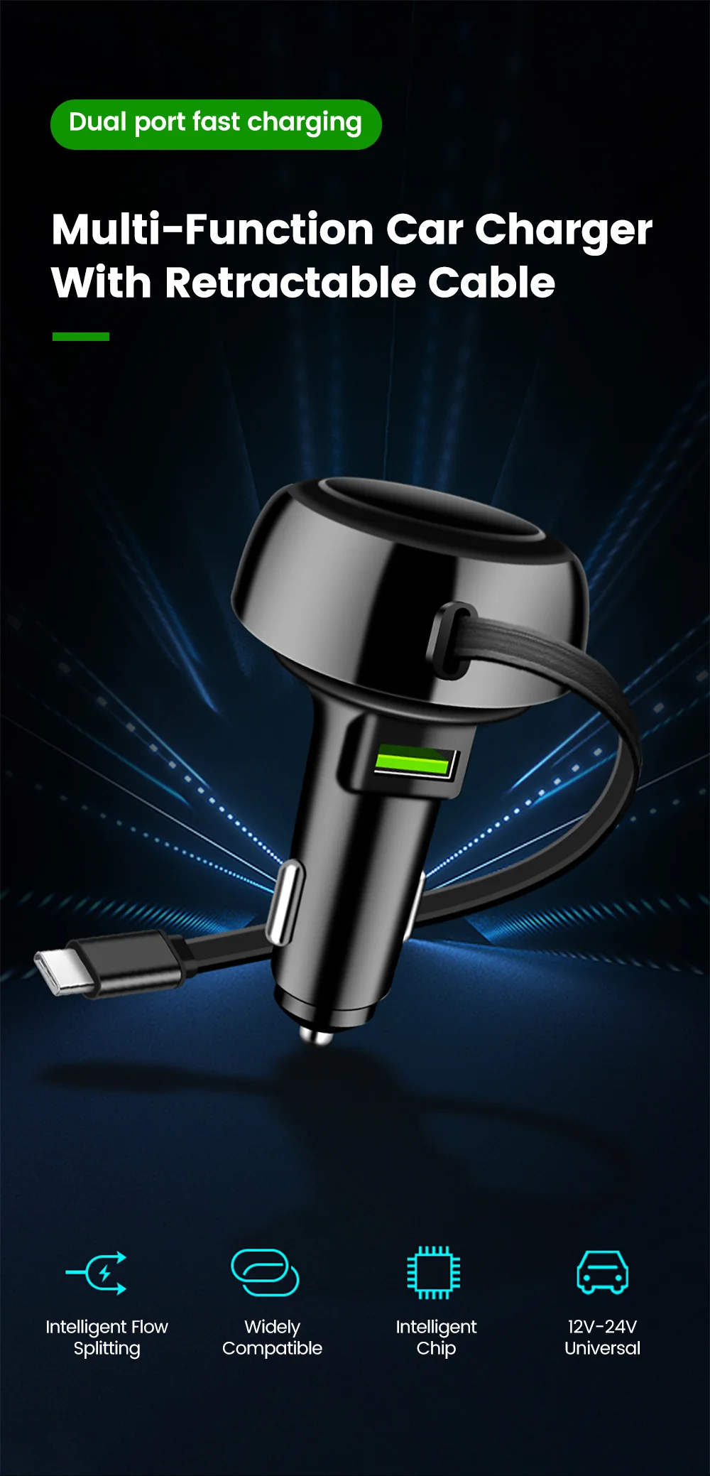 66W Car Charger Fast Charging USB Car Charger With Retractable Type C Cable Multi-Function car Charger For Xiaomi Samsung Huawei