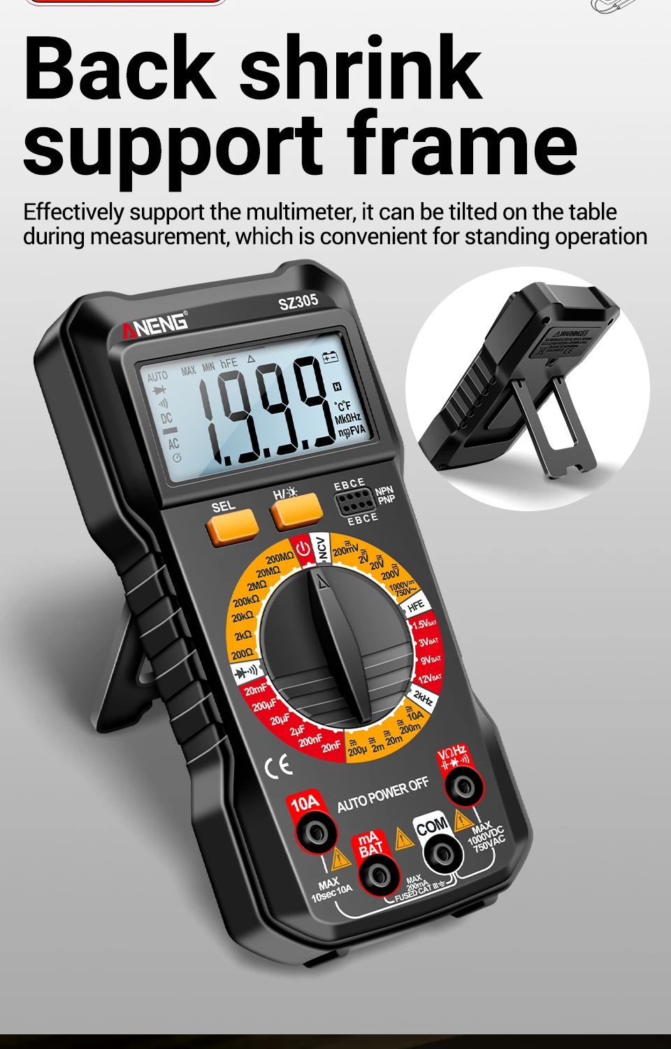 ANENG SZ305 is a handheld digital multimeter, designed and produced according to international electrical safety standards, used to measure AC/DC voltage, AC/DC current, resistance, capacitance, diode and other functions.