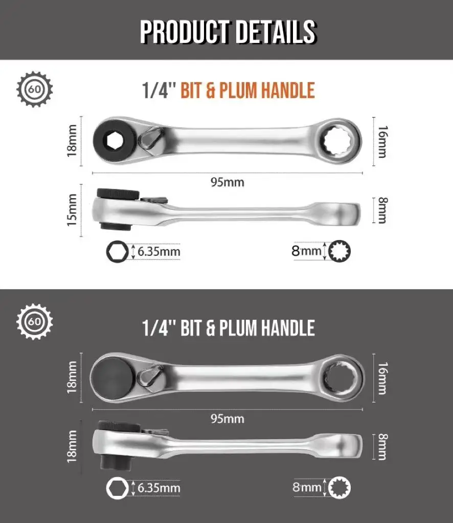 Item Name: 1/4' Mini Socket handle Ratchet Handle Wrench;1/4' Mini Bit handle Ratchet Handle Wrench; 2-in-1 Ratchet Handle Wrench.