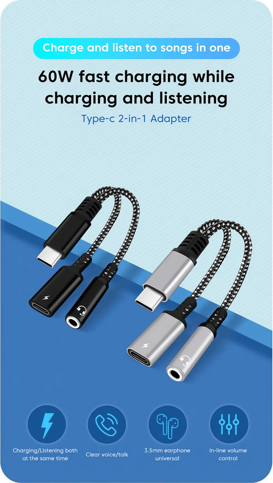 NNBILI 2in1 1in1 USB Type C to 3.5mm Headphone Audio Aux jack Adapter PD 60W Fast Charging Cable for iPhone 15 Samsung Xiaomi
