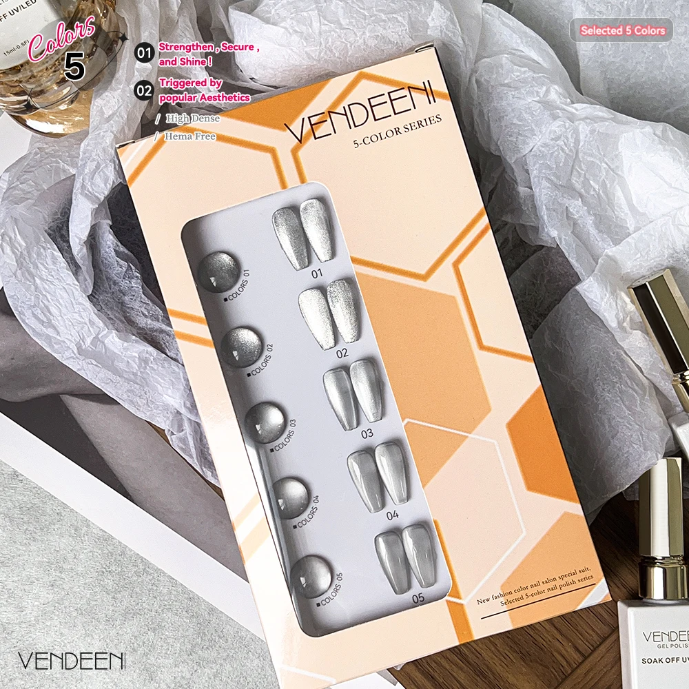 Vendeeni 5 Colors/Set Silver Crystal Cat Eye Gel Nail Polish Magnetic UV Soak Off Gel Varnish Glass Bead Cat Eye Gel With Display