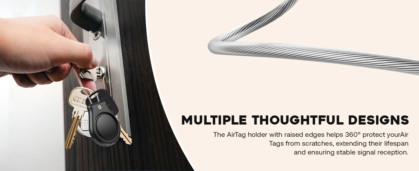 The Airtag case features a secure hexagon socket screw and braided steel cable, ensuring a strong grip. Its durable construction prevents slips or damage, offering lasting protection for your belongings
