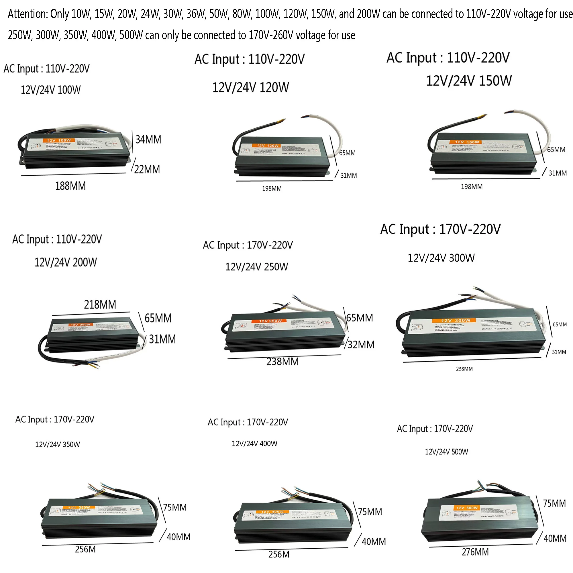 Attention: Only 10W, 15W, 20W, 24W, 30W, 36W, 50W, 80W, 100W, 120W, 150W, and 200W can be connected to 110V-220V voltage for use