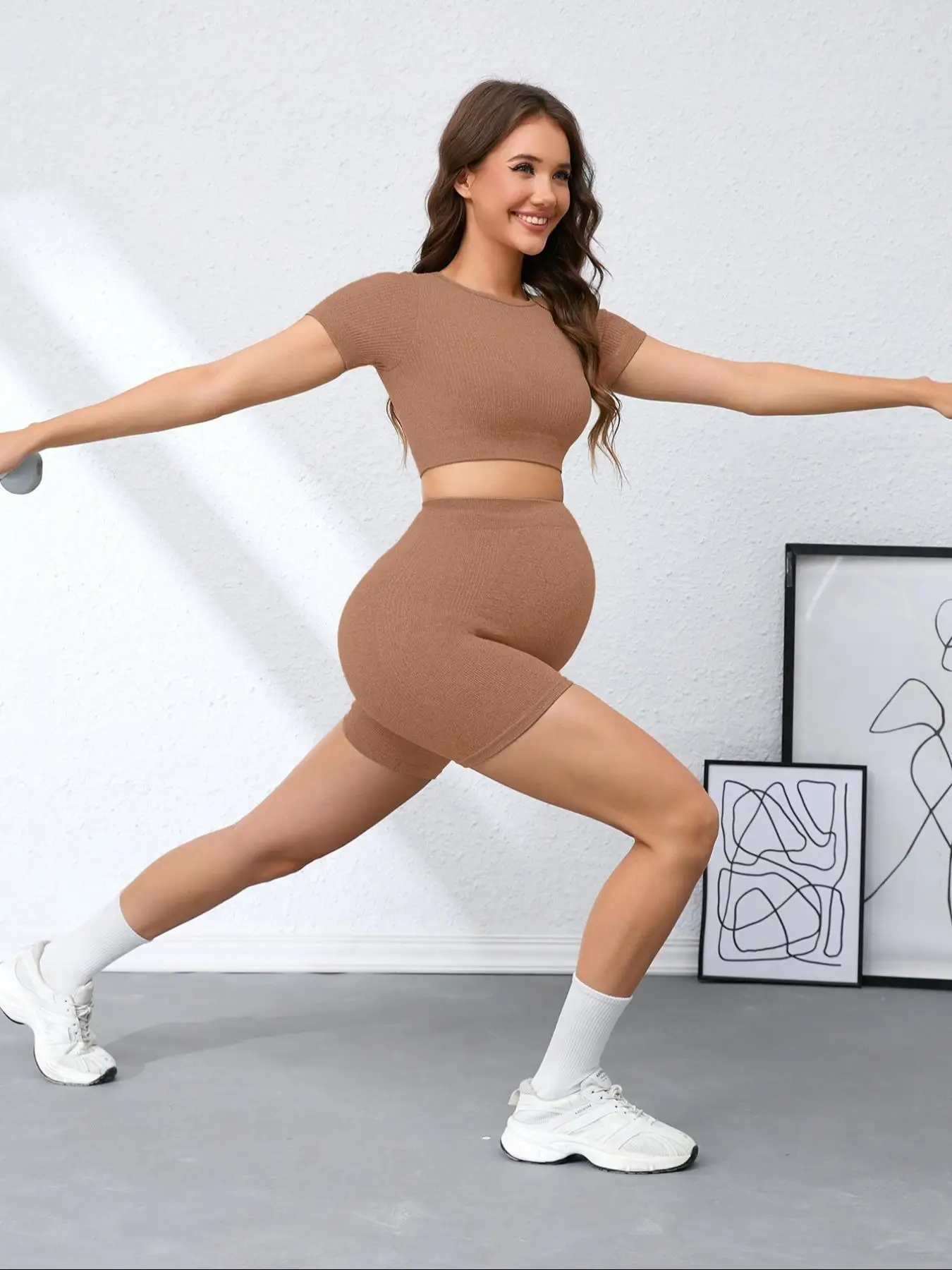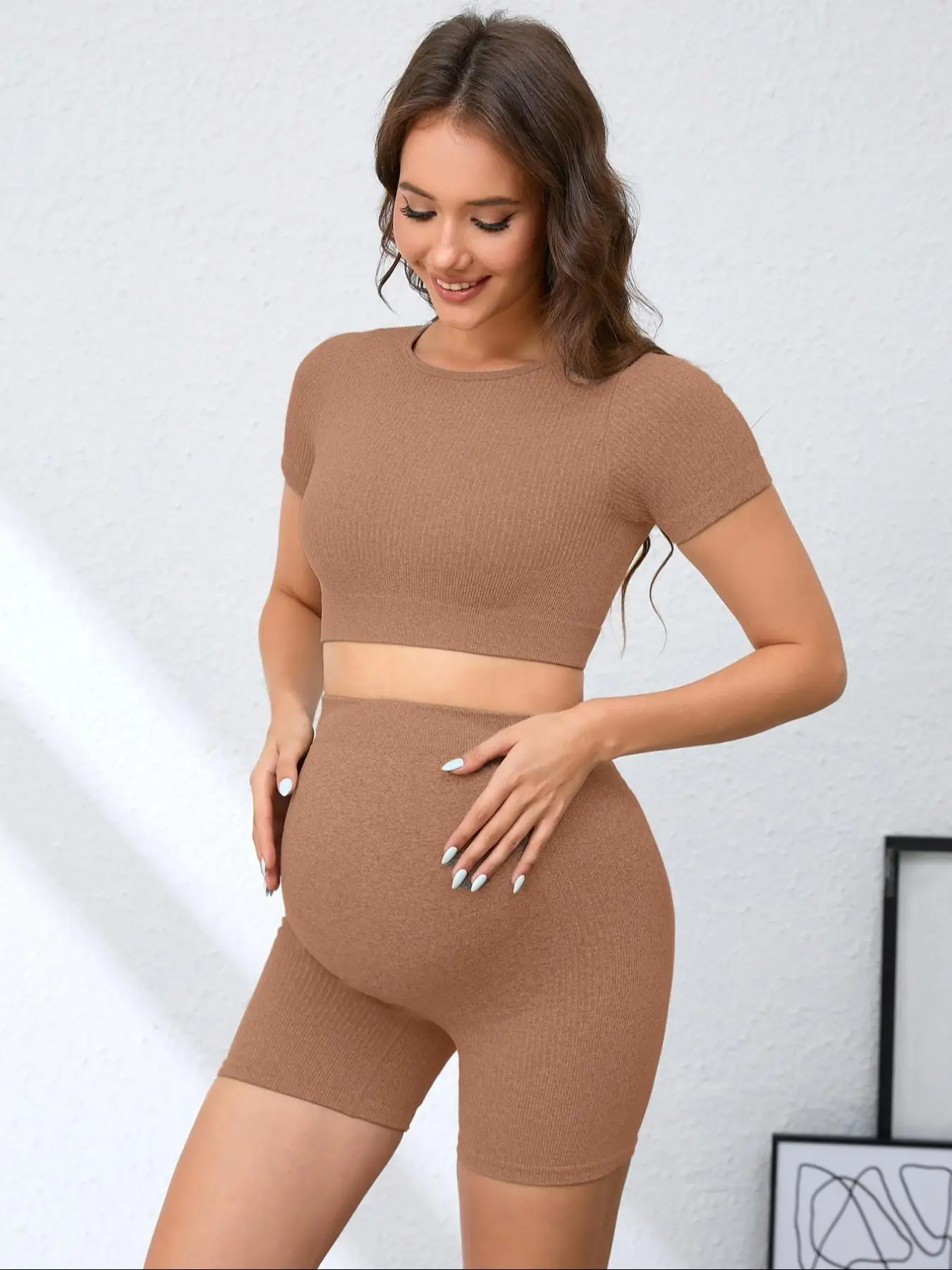 Women's Maternity 2 Piece Seamless Short Sleeve Crop Top Legging Sets Workout Casual